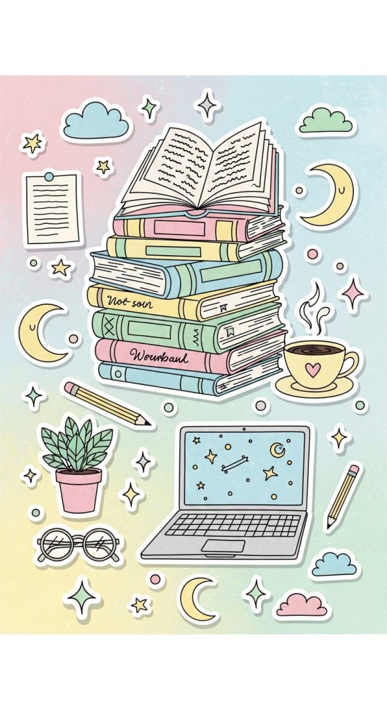Hand-drawn doodles such as books, coffee cups, stars, and laptops create a fun and creative study vibe. Use soft pastel markers or digital brushes.