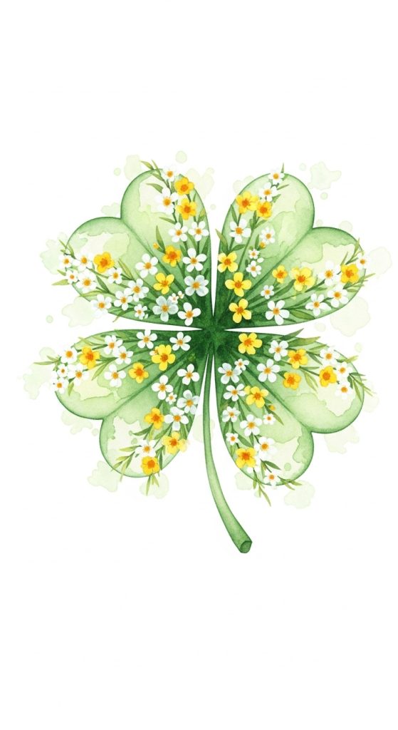 Fill each shamrock leaf with tiny watercolor flowers such as white blossoms or soft yellow florals. This adds a springtime aesthetic to the design.