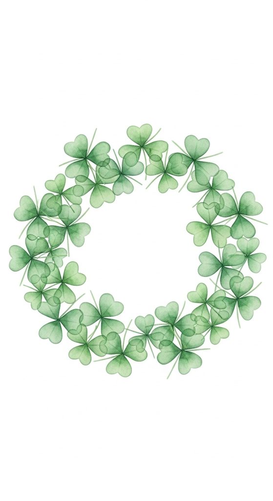 Create a circular wreath made of multiple watercolor shamrocks arranged delicately around a blank center space.