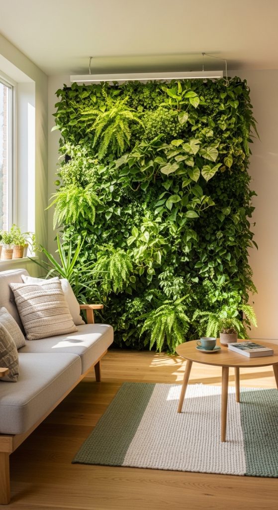 Green walls add freshness and a calming vibe to bedrooms, living rooms, or home offices.