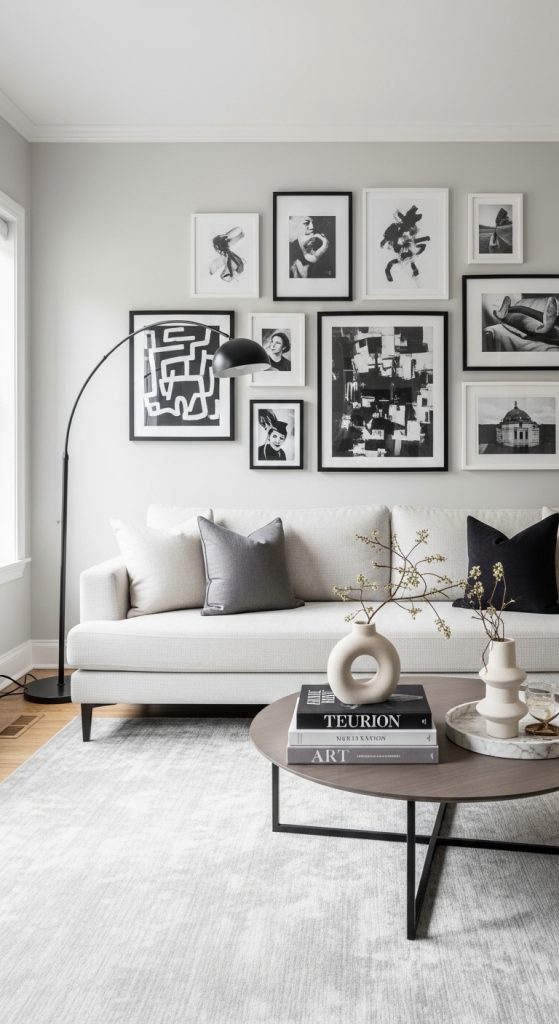 Stick to a consistent color palette—such as black and white or earthy tones—for a cohesive look. Gallery walls are ideal for showcasing personality and creativity.