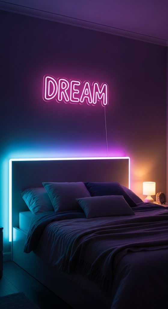 LED strip lights or neon signs can instantly modernize your space. Soft warm LED backlighting behind a headboard or desk creates a cozy ambiance.