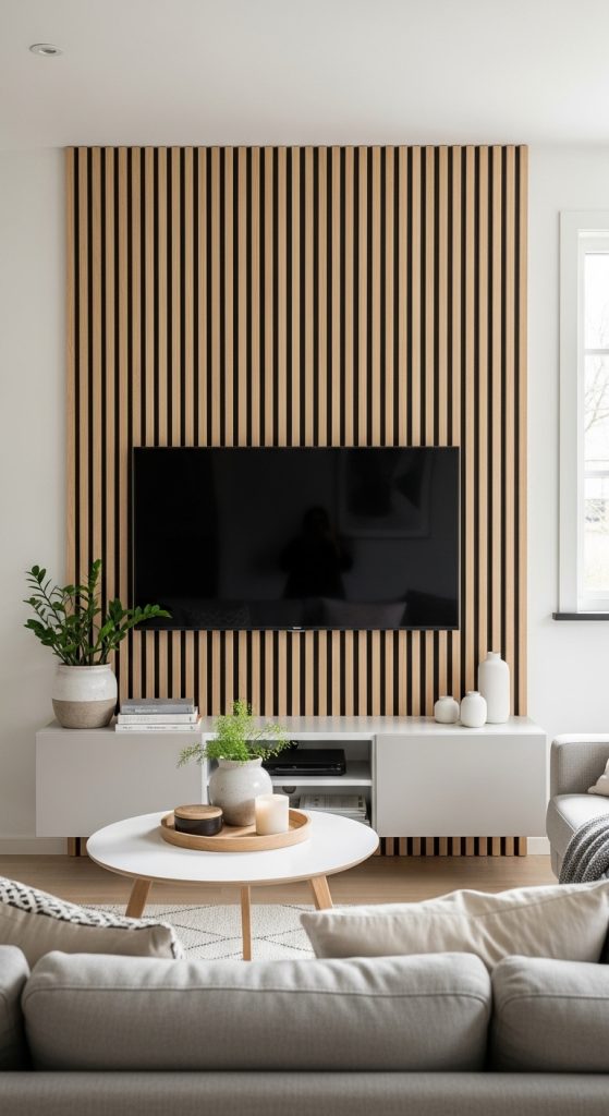 Use light oak for a bright feel or darker walnut tones for drama. Wooden slat walls are especially popular behind TV units or as bedroom headboard backgrounds.