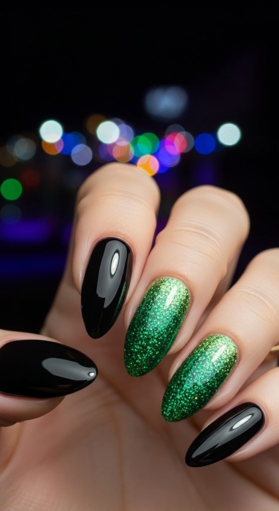 If you love dramatic designs, combine black polish with green accents. Paint most nails black and add green glitter, stripes, or shamrock details on accent nails.
