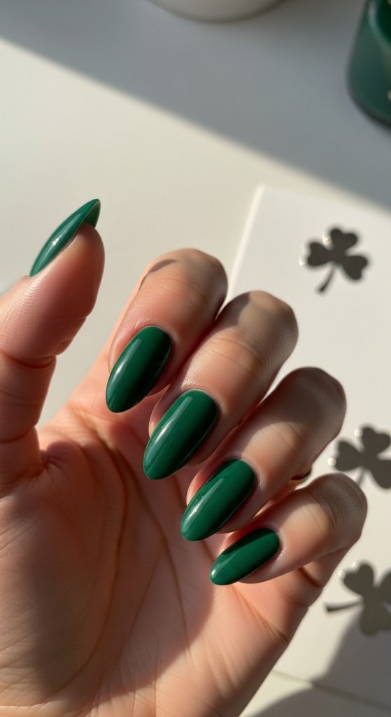 You can never go wrong with a timeless emerald green manicure. This rich shade symbolizes luck and elegance, making it a top choice for St. Patrick’s Day nail ideas.