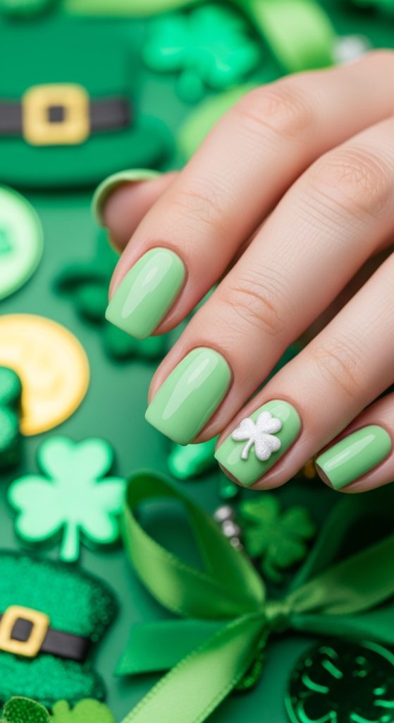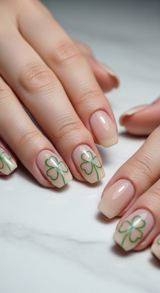 Minimal nail art is trending in 2026. Paint your nails a nude or soft pastel green base and add a thin clover outline in dark green or gold.
