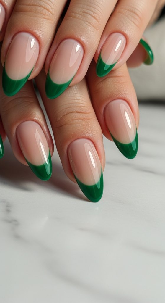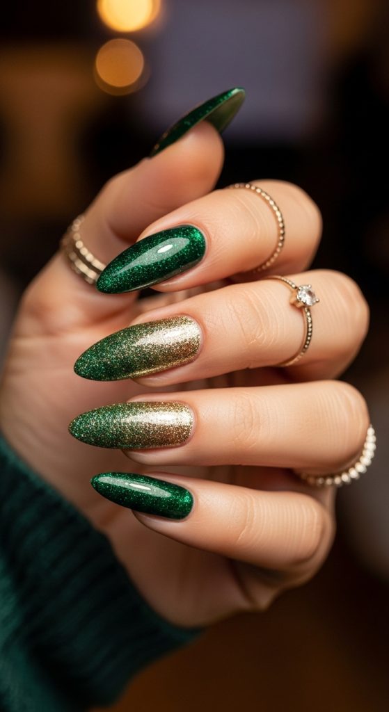 If you love glam styles, try a green-to-gold glitter ombre design. Start with a dark green base and gradually blend gold glitter toward the tips.