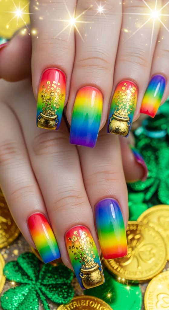 Inspired by Irish folklore, rainbow nails with a tiny pot of gold accent create a fun and colorful manicure.