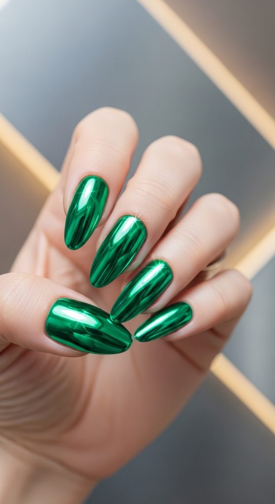 Chrome nails are one of the biggest nail trends of 2026. A metallic green chrome finish creates a futuristic, high-shine effect that stands out in photos.