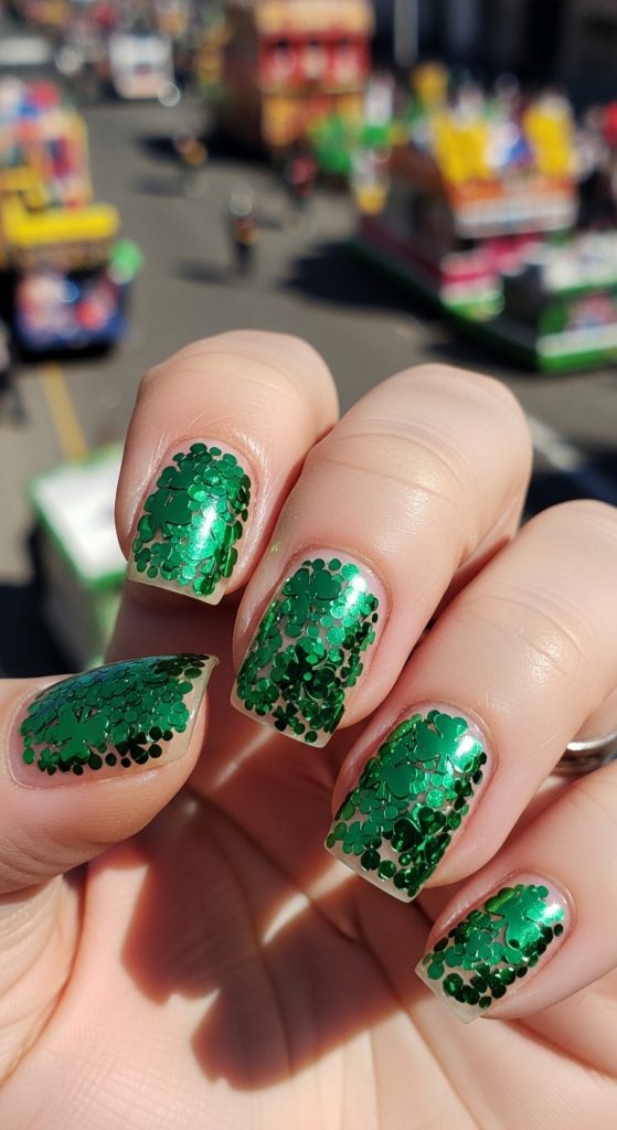 For a fun party vibe, try clear or light green nails filled with glitter shamrock confetti pieces.