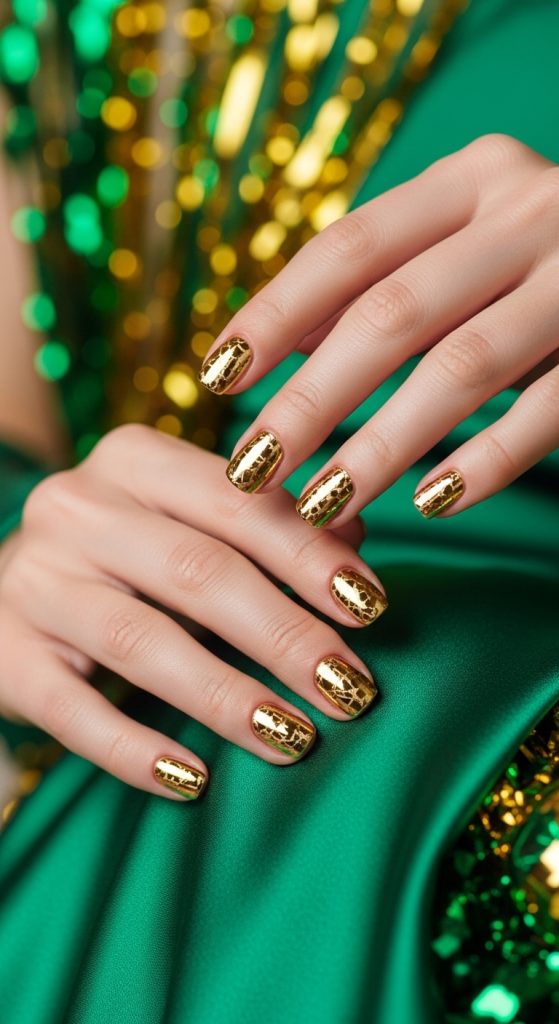 Chrome nails add a futuristic shine and look stunning in photos. This combo is ideal for influencers and fashion-forward women celebrating St. Patrick’s Day in style.