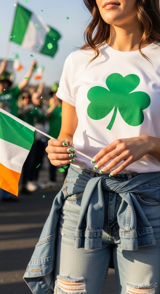 For a casual yet cute look, wear a shamrock graphic t-shirt with ripped jeans and white sneakers. Match it with nude or pastel green nails featuring tiny hand-painted clovers.