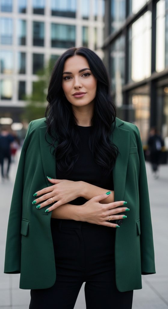 A tailored green blazer paired with black skinny jeans or tailored pants gives a sophisticated edge. Complement this outfit with modern green French tip nails.