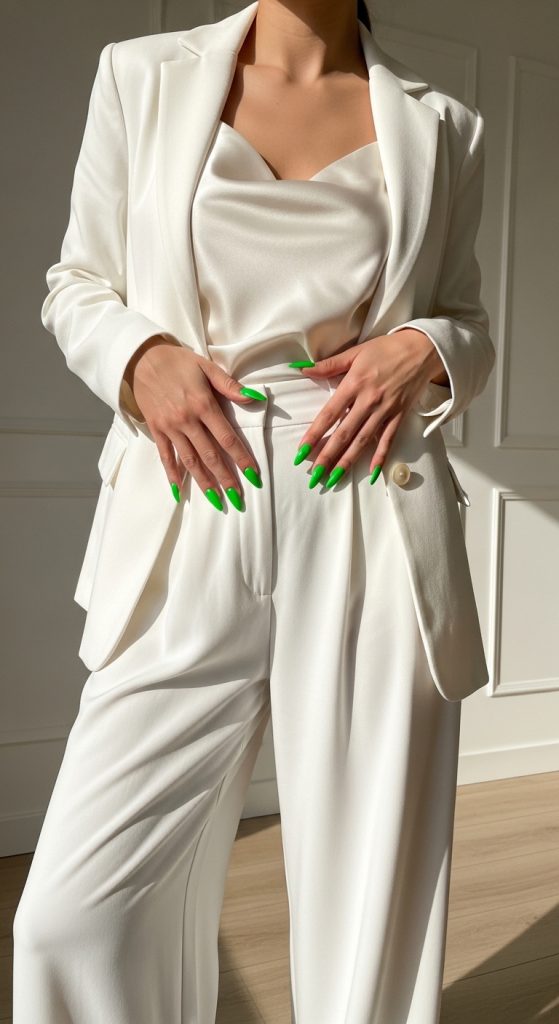 If you want your nails to stand out, wear an all-white outfit and opt for bold neon green nails. The contrast will instantly draw attention.