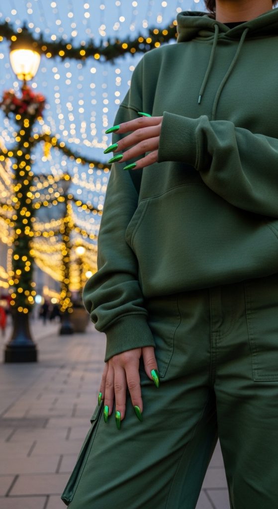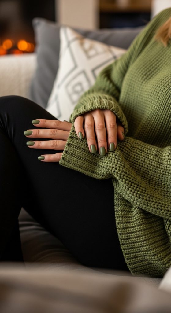 For colder weather, style a cozy oversized green sweater with black leggings or skinny jeans. Pair it with matte olive nails for a trendy yet subtle finish.