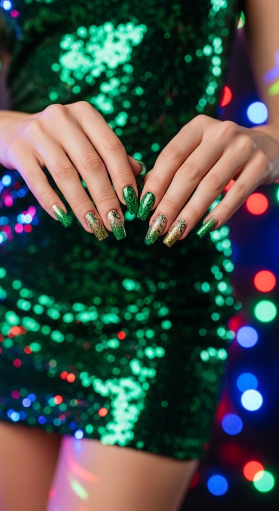 If you prefer darker tones, wear a sleek black outfit—such as a black jumpsuit or dress—and add green glitter accent nails.