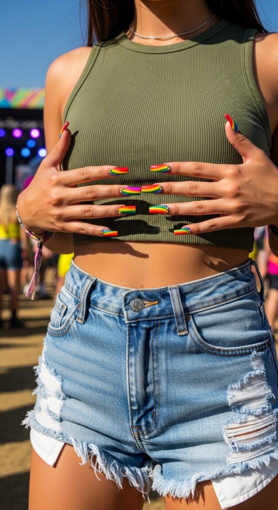 7. Denim Shorts & Crop Top with Rainbow Nail Art