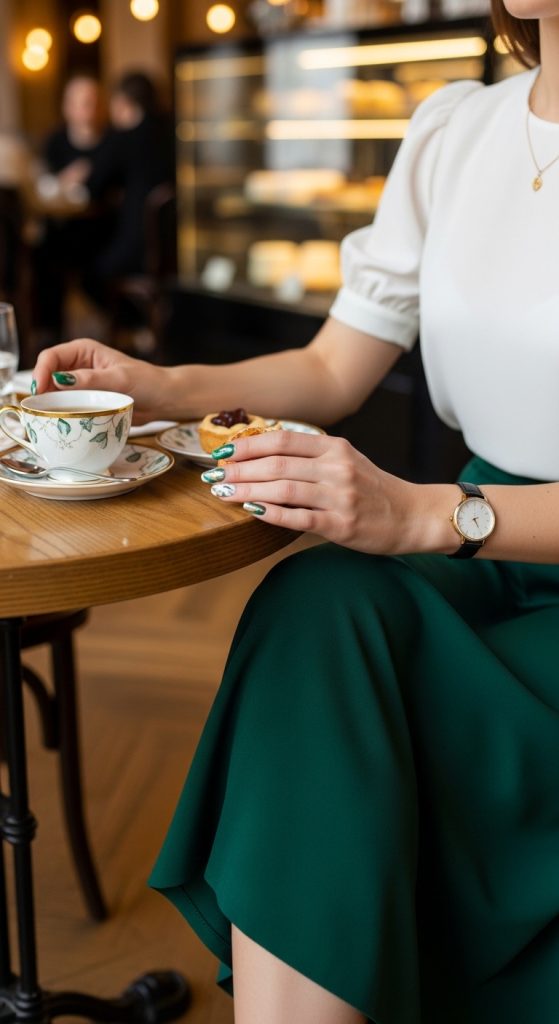 Pair a flowy green midi skirt with a white blouse and nude heels for a chic brunch look. Complement the outfit with marble-effect nails mixing white, green, and subtle gold veins.