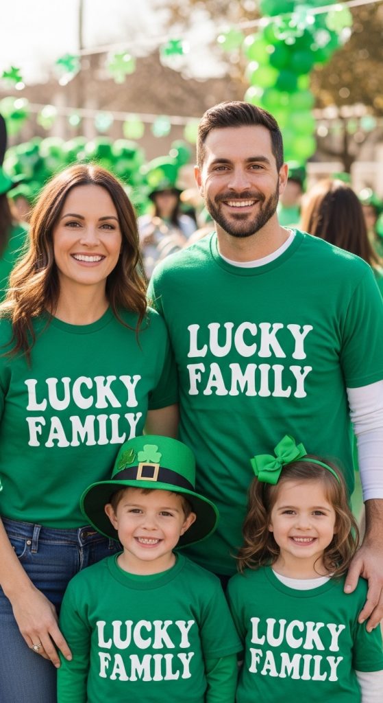 One of the most popular family St. Patrick’s Day outfit ideas is matching graphic tees. Shirts that say “Lucky Mama,” “Lucky Dad,” “Lucky Mini,” or “Lucky Squad” create a cute coordinated look.