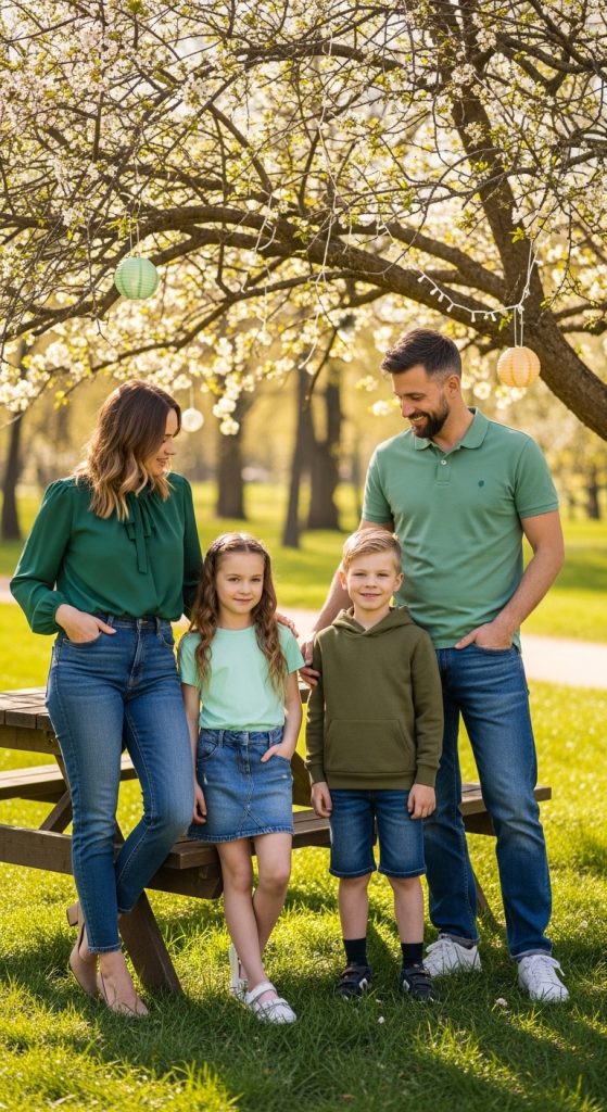 For example, mom can wear an emerald blouse, dad can choose a green polo, and kids can wear shamrock tees. This simple coordination looks polished without being overly themed.