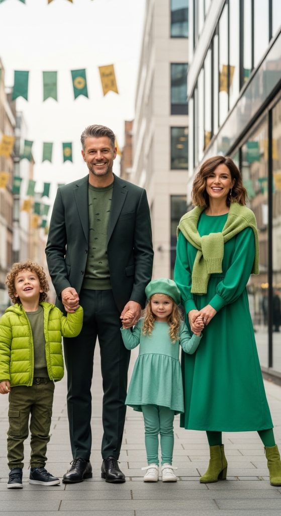 When choosing outfits, focus on comfort for kids and weather-appropriate layers. Shades like emerald, mint, sage, and forest green are trending in 2026. Adding gold accents, shamrock patterns, and playful accessories completes the look.