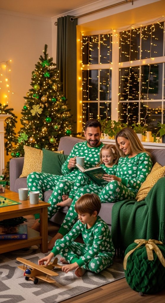 Matching green sleepwear sets with clover prints are perfect for relaxed celebrations. Capture cute family photos before bedtime to remember the day.