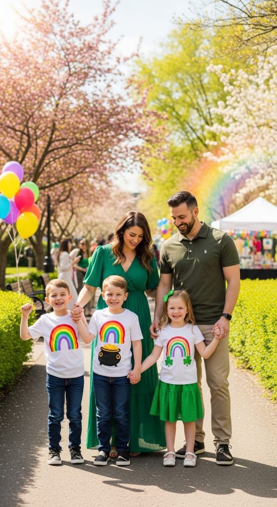 Inspired by Irish folklore, dress the family in rainbow-themed tops with gold accents. Kids can wear colorful shirts featuring rainbows and pots of gold, while parents keep it subtle with green outfits and gold accessories.