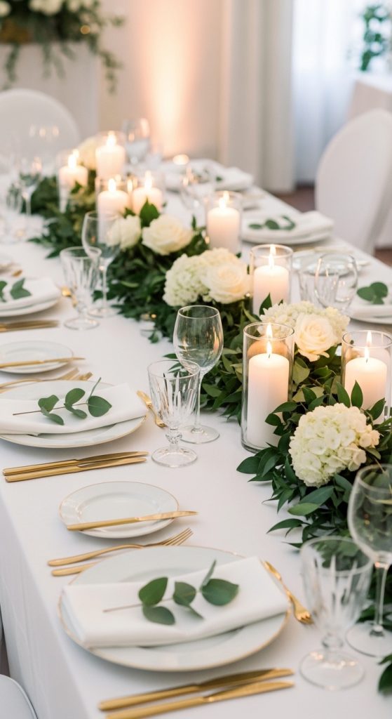 For a modern approach, opt for a minimalist green and white theme with subtle gold accents.