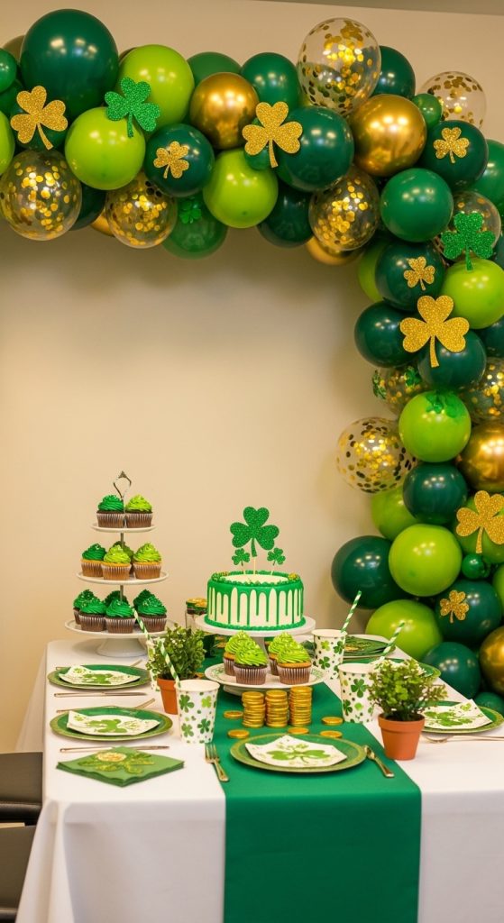 SEO Keywords: St. Patrick’s Day balloon garland, green and gold party décor ideas.