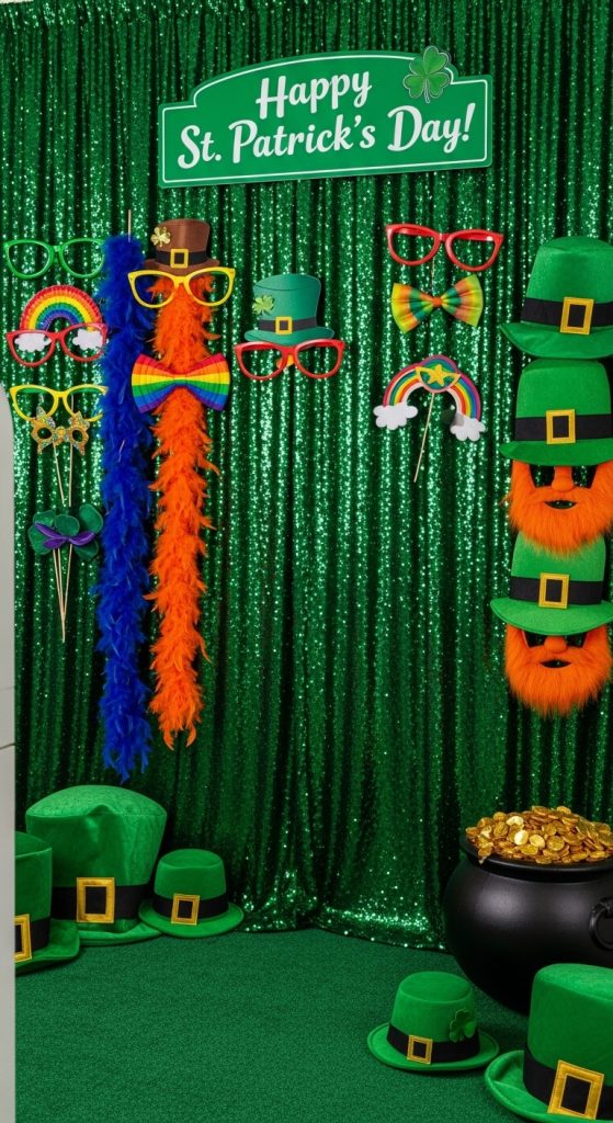 Set up a DIY photo booth with shamrock backdrops, rainbow props, leprechaun hats, and gold coin decorations.