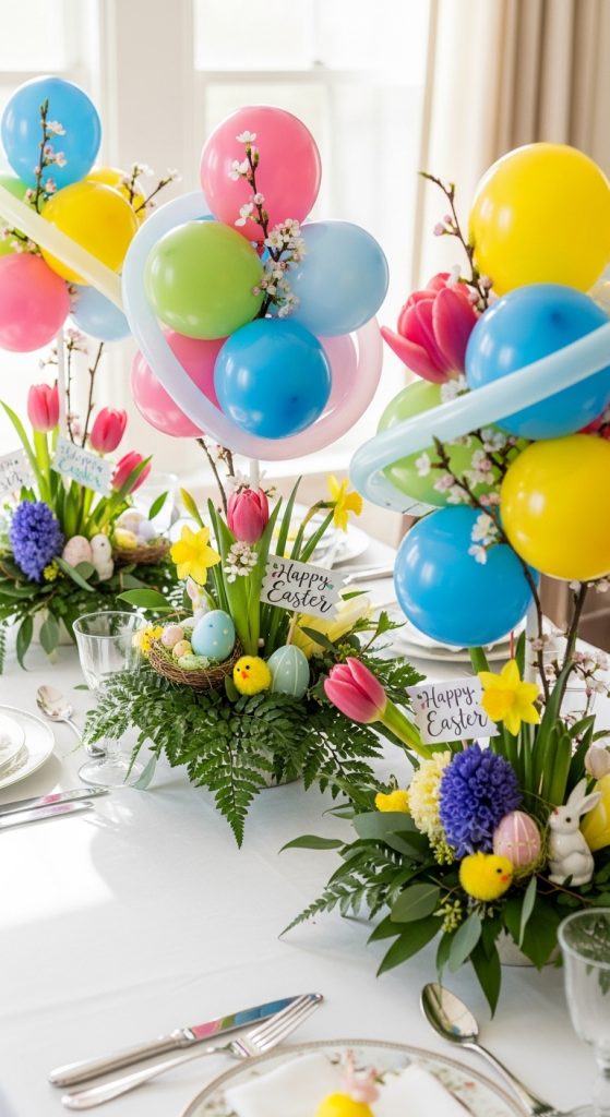 Turn balloon clusters into stunning table centerpieces. Combine pastel balloons with fresh spring flowers, greenery, or Easter-themed props like mini chicks or carrots. This instantly elevates your table décor and ties the theme together beautifully.
