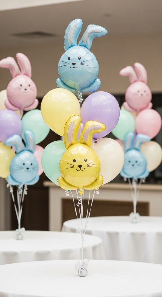 Design balloon bouquets with bunny-shaped balloons combined with pastel latex balloons. Place them around tables, at entryways, or near gift stations. These playful bouquets add height, dimension, and a whimsical touch to your Easter décor.