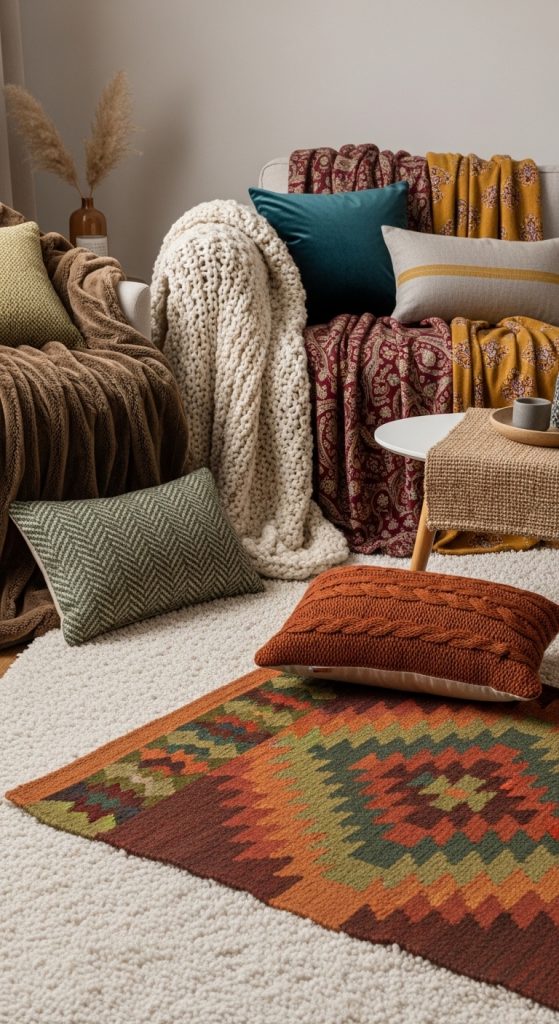 Incorporate seasonal textures through throws, cushions, rugs, and upholstery. Linen and cotton are perfect for warmer seasons, while wool, velvet, and faux fur are ideal for colder months. Layering textures adds depth and visual interest to your living room décor and enhances seasonal comfort.