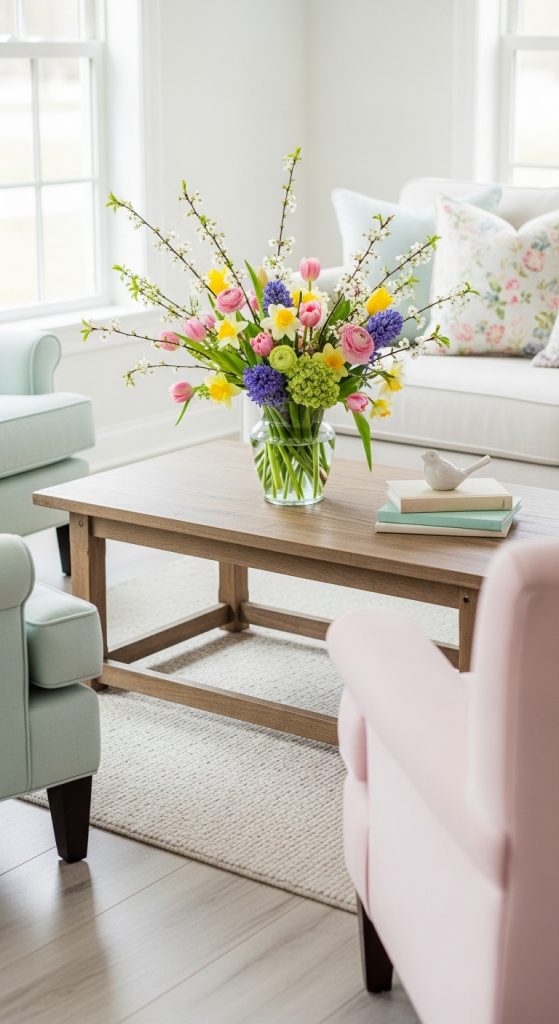 Adding seasonal flowers is one of the easiest ways to refresh a living room. Spring tulips, summer sunflowers, autumn chrysanthemums, and winter poinsettias bring vibrant color and natural beauty indoors. Place flowers in vases on coffee tables, side tables, or shelves. Mixing in greenery like ferns or eucalyptus adds volume and texture to your arrangement.