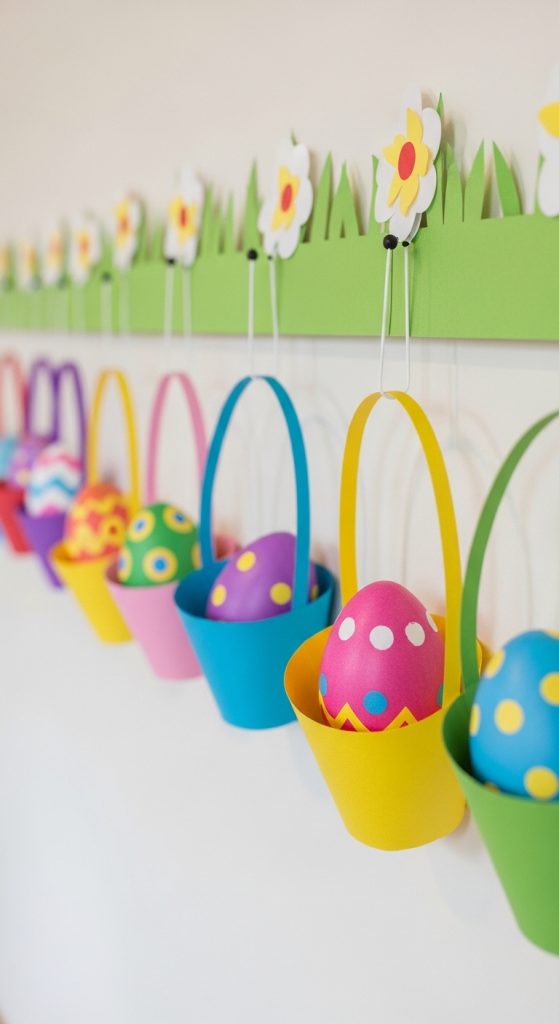 They can decorate the eggs with patterns, glitter, and stickers before placing them inside the baskets. Hanging these baskets around the classroom creates a festive Easter display.