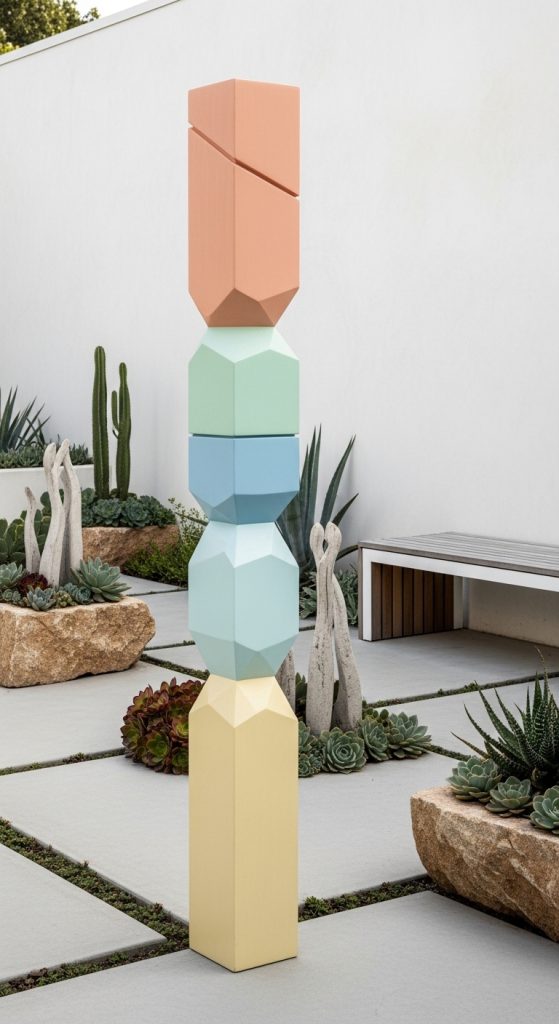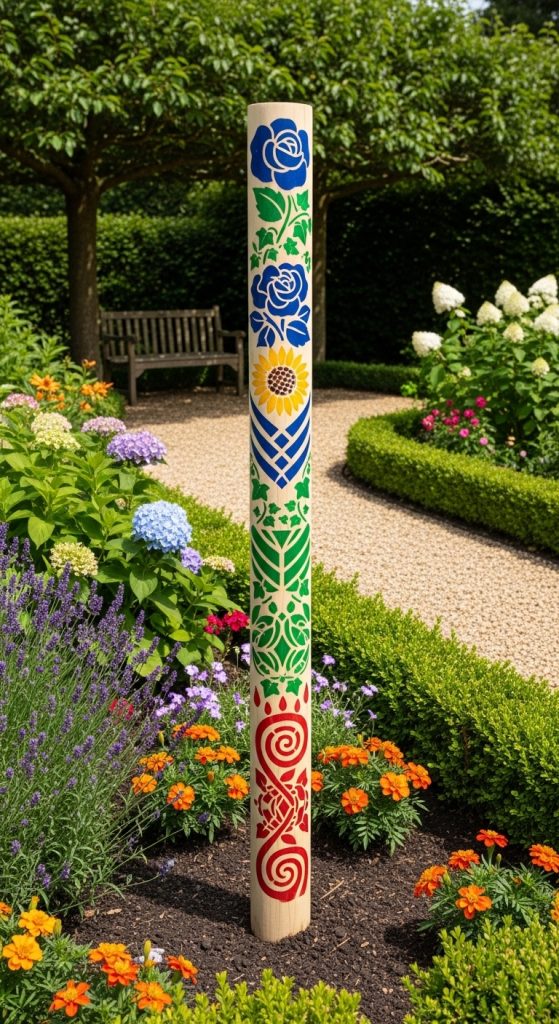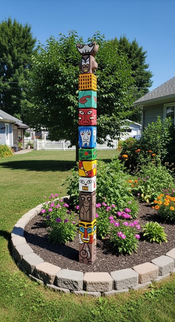 Start with a tall wooden post as the base and paint stacked sections with vibrant colors and patterns. You can include geometric shapes, animal motifs, or abstract designs. This classic style allows homeowners to personalize their garden art while adding bold visual interest.