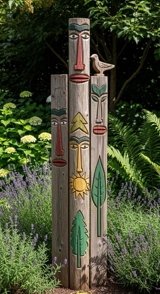 Use old wooden pallets, fence posts, or driftwood to create a rustic and eco-friendly totem pole. Stack and secure the wood, then enhance with minimal paint or carvings to maintain a natural aesthetic. This approach is perfect for those who love sustainable DIY projects.