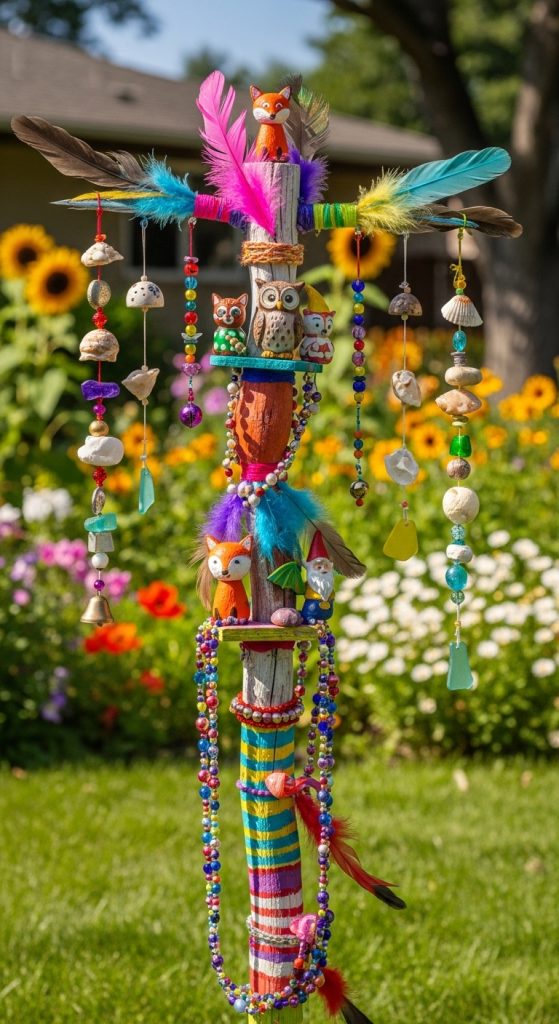 Add quirky elements such as miniature figurines, colorful beads, feathers, or even wind chimes. A whimsical totem pole brings movement, personality, and fun to your garden, making it a focal point that invites admiration and curiosity.