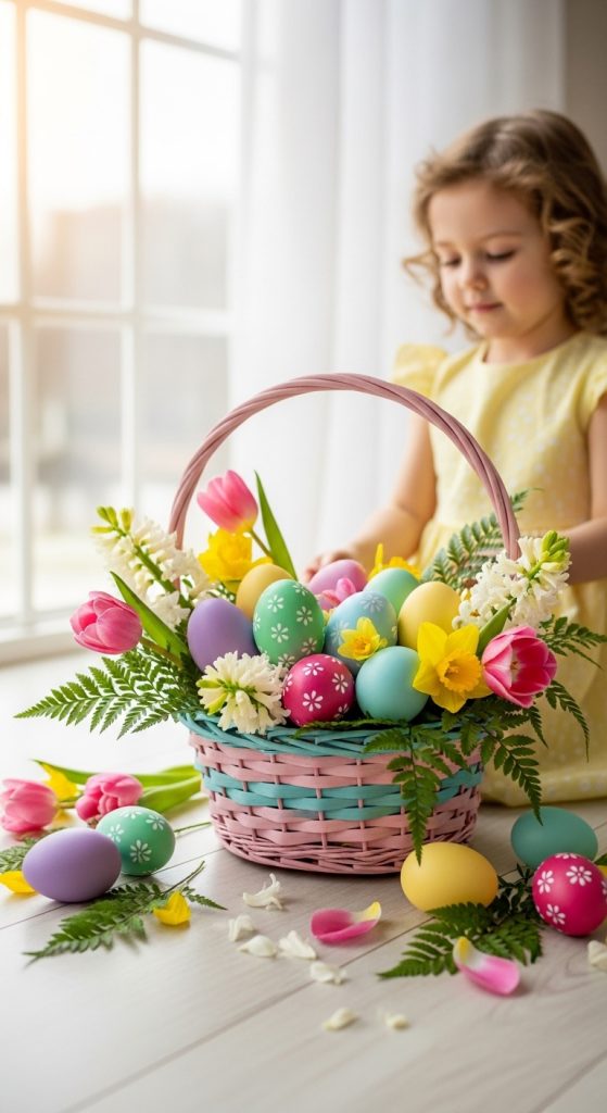 One of the most classic Easter photoshoot ideas is using colorful Easter baskets filled with eggs, chocolates, and small toys. Place the basket near a bright window with natural light and add pastel decorations like flowers or ribbons. Children holding or playing with the basket create natural, joyful photos.