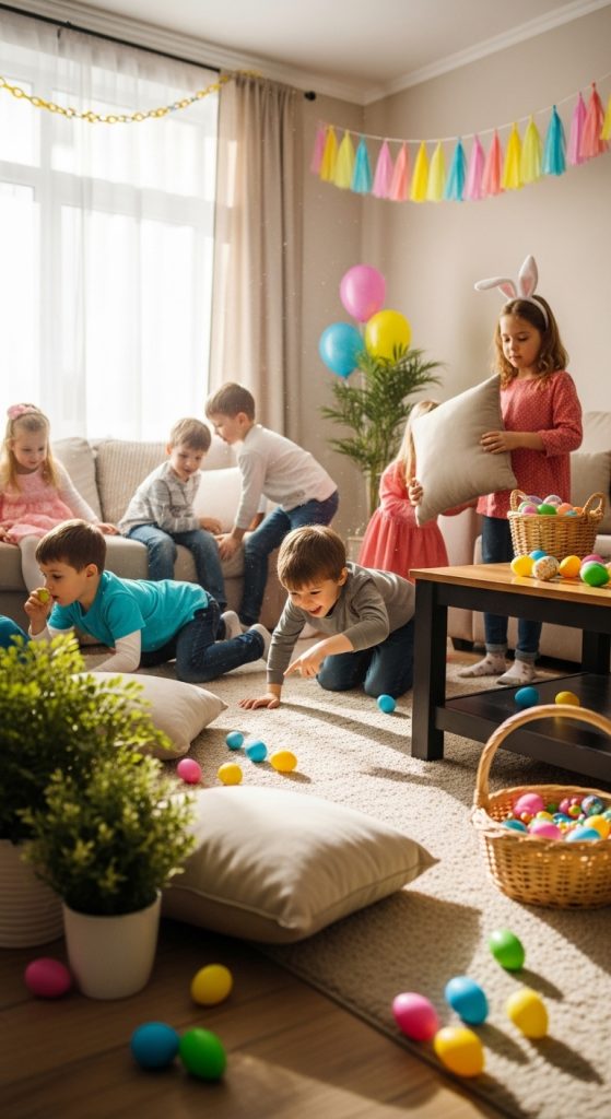 Recreate a mini Easter egg hunt inside your home. Scatter colorful eggs on the floor, table, or a decorated mat. Capture the excitement as kids search for the eggs. This type of photoshoot captures authentic expressions and natural moments.