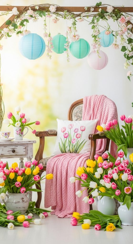 Spring flowers instantly add a seasonal touch to photos. Arrange tulips, daisies, or artificial flowers around a chair or bench. The floral background combined with soft lighting creates a beautiful Easter aesthetic that looks professional even when done at home.