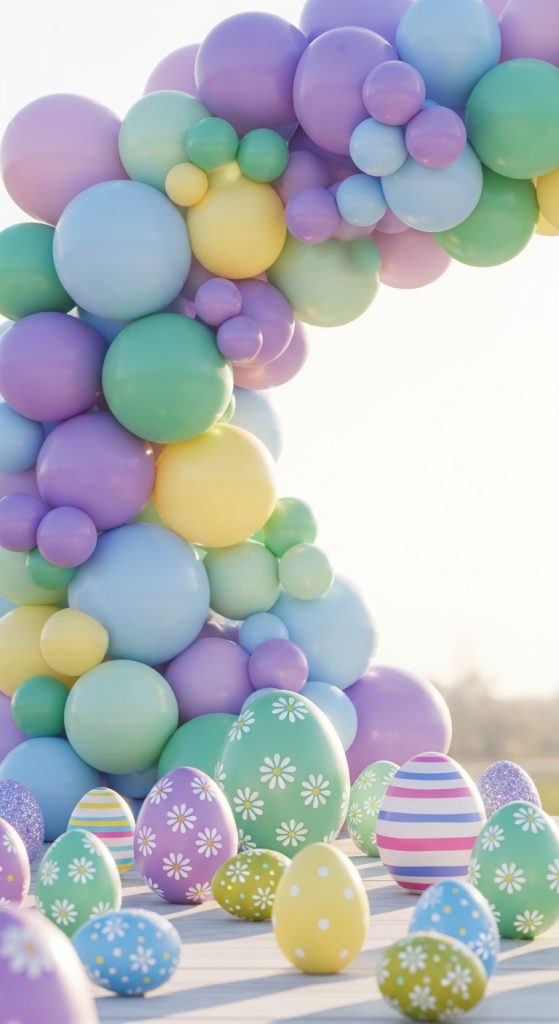 Create a dreamy backdrop using pastel balloons in soft pink, yellow, lavender, and mint colors. Arrange them in an arch or cluster behind the subject. This setup is simple, affordable, and extremely popular for Pinterest-style Easter photoshoots.