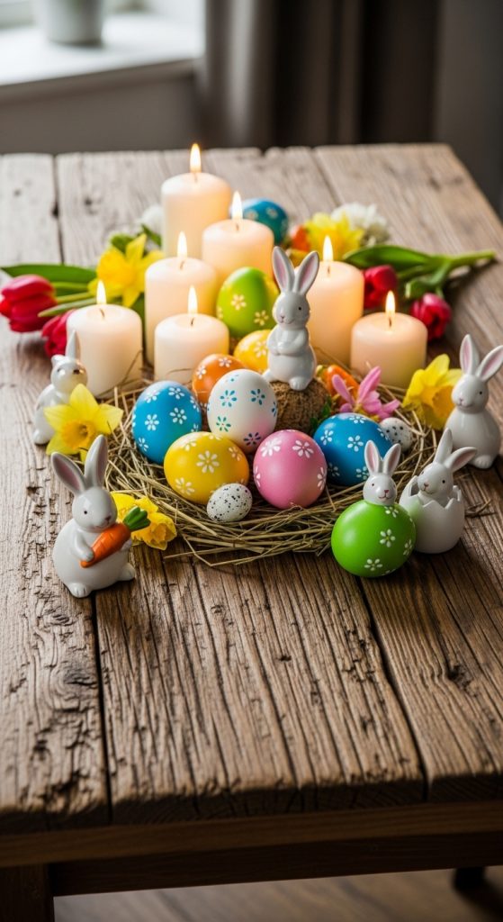 Decorate a small table with Easter eggs, candles, flowers, and bunny figurines. Photograph subjects sitting near the table as if they are preparing for an Easter brunch. Wooden textures and soft colors give the scene a rustic spring aesthetic.