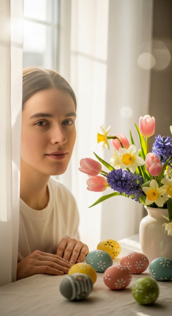 Use natural window light to create soft silhouettes or bright portraits. Place your subject near a window with sheer curtains and simple Easter props like eggs or flowers. Natural lighting gives the photos a clean, professional look.