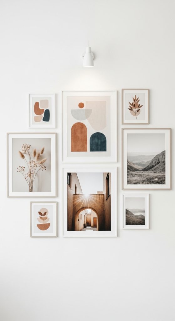 A gallery wall is one of the most popular aesthetic wall decor ideas. Choose several frames in neutral colors like white, black, or beige and arrange them in a balanced grid or creative layout. Fill the frames with abstract art, quotes, or photography. This style works beautifully in living rooms, bedrooms, or hallways.