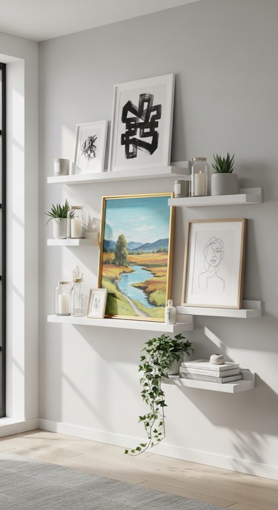 Floating shelves allow you to display art in a creative and flexible way. Place framed artwork, small sculptures, candles, or plants on the shelves to create a layered wall design. This approach makes your wall decor dynamic and easy to update.
