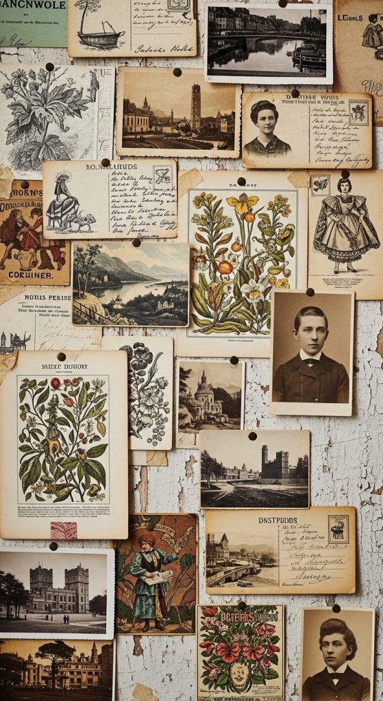 A vintage collage wall is perfect for those who love artistic and nostalgic decor. Combine vintage illustrations, postcards, maps, and old photographs to create a unique visual story on your wall. This style works well in creative spaces or bedrooms.