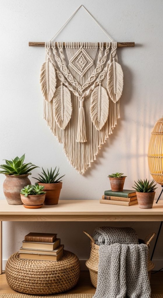 Handmade wall art adds personality and uniqueness to your home. Macrame wall hangings, woven tapestries, or DIY painted panels can create a cozy and artistic atmosphere. These crafts are especially popular in boho and Scandinavian interiors.