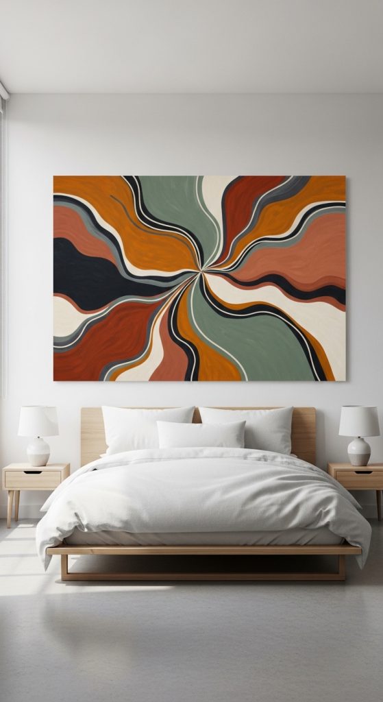 Sometimes one large piece of artwork is enough to transform a wall. A large painting or framed print placed above a sofa, bed, or dining table creates a bold focal point that draws attention and enhances the room’s aesthetic.