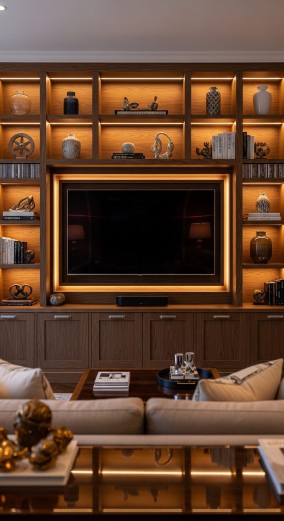For a high-end look, consider an entertainment center with built-in LED lighting. These lights highlight shelves, decor items, and the TV area, creating a cinematic experience right in your living room.